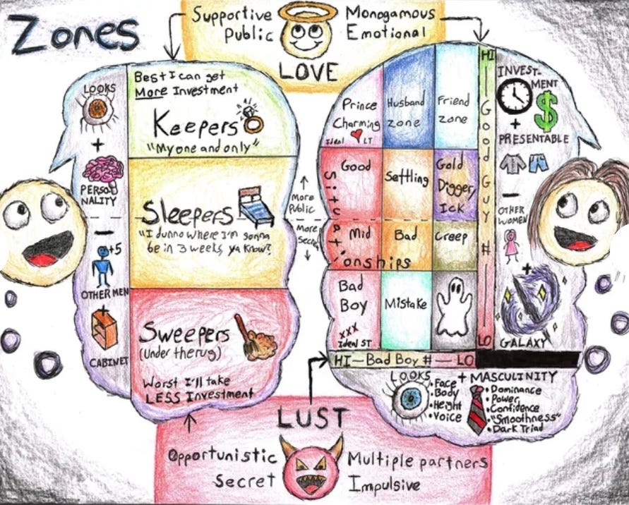 The chart simplifies the complex world of dating by categorizing women into groups such as 'Keepers' and 'Sleepers'. 'Keepers' are those who are deeply valued by men and often find themselves in committed relationships. They represent the epitome of mutual respect and investment. On the contrary, 'Sleepers' are women whom men like but do not fully commit to. These relationships may occasionally surface in public, but they typically remain casual, hinting at a lack of deep connection or long-term intentions.